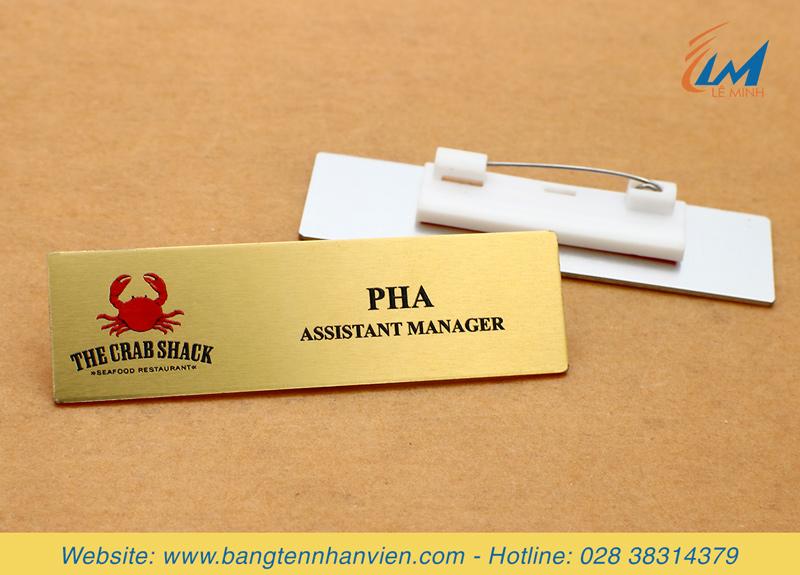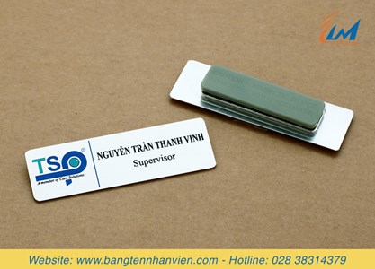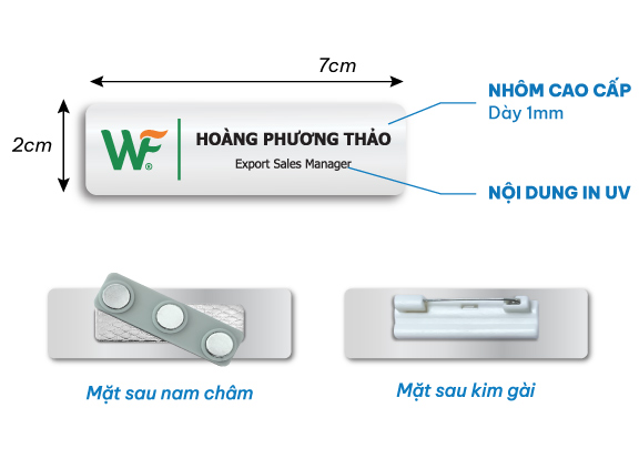 - Bảng tên nhân viên nhôm có các kích thước 6 x 2cm, 6.5 x 2cm, 6.5 x 2.2cm, 7 x 2cm, 7 x 2.2cm,... Mặt trước sử dụng công nghệ in UV. Mặt sau gắn kim gài hoặc nam châm để cài vào áo. Bảng tên có thiết kế đơn giản, thời gian sản xuất nhanh chóng, có thể nhận hàng ngay trong ngày.