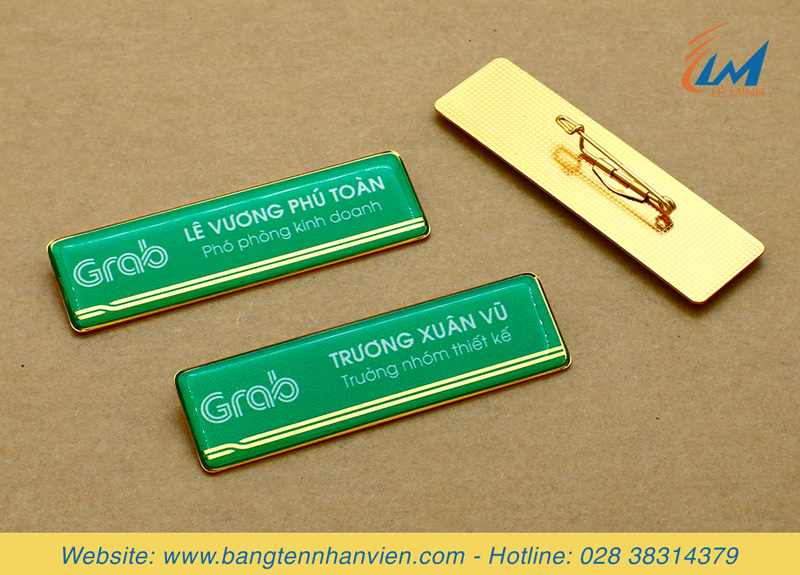 Bảng tên, thẻ tên đeo áo Grab làm từ chất liệu đồng xi mạ vàng hoặc bạc sáng bóng có kích thước căn bản 7 x 2cm. Mặt trước sử dụng công nghệ in UV nội dung màu sắc theo yêu cầu phủ thêm lớp keo trong suốt để bảo vệ, tăng độ bền. Mặt sau gắn kim gài để cài vào áo.
