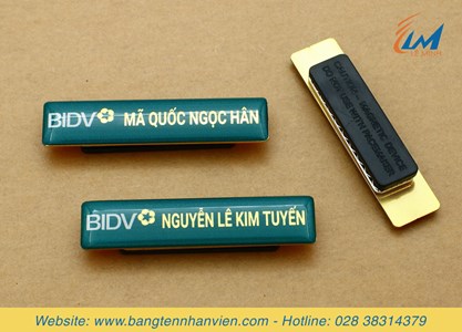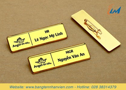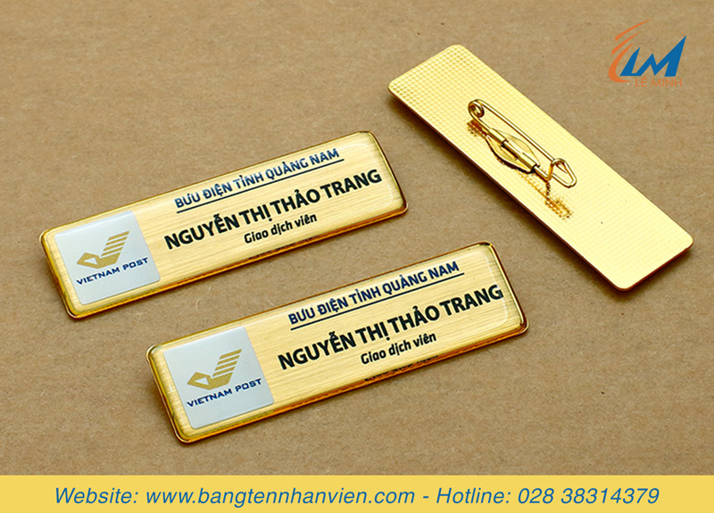 - Phôi đồng với bề mặt xi mạ vàng hoặc bạc tạo vẻ ngoài sáng bóng, sang trọng, phù hợp với môi trường làm việc chuyên nghiệp. Bên ngoài bảng tên phủ một lớp keo hữu cơ có tác dụng tăng độ bền và sáng bóng cho bảng tên, bảo vệ lớp mực in bên trong, giữ cho màu mực của bảng tên luôn tươi mới.