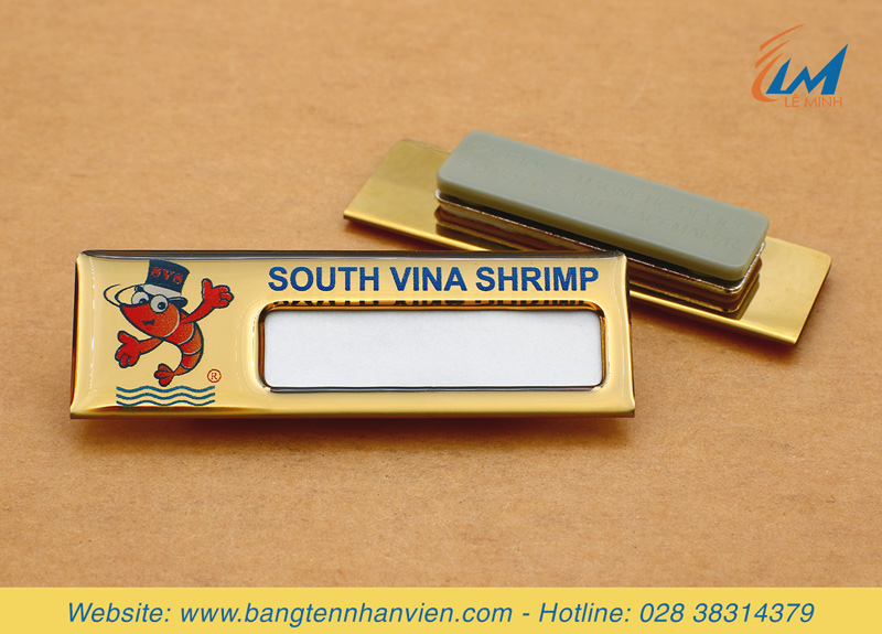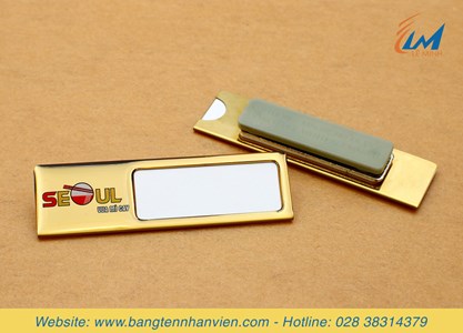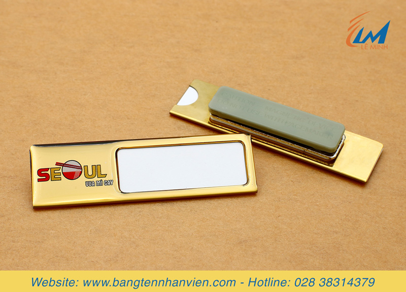 - Thẻ tên cài áo thay được tên mẫu Mỳ cay Seoul làm từ chất liệu inox cao cấp, có thể tùy chỉnh kích thước, thông dụng là 6.5 x 2cm, 7 x 2cm,... có khe thay đổi tên nhân viên. Mặt trước sử dụng công nghệ in UV nội dung màu sắc theo yêu cầu phủ thêm lớp keo trong suốt để bảo vệ, tăng độ bền. Mặt sau gắn kim gài hoặc nam châm để cài vào áo.